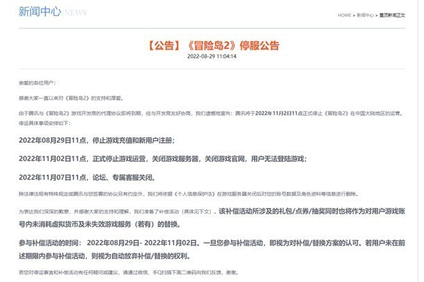 据悉,由于腾讯与《冒险岛2》游戏开发商的代理协议即将到期,腾讯宣布将于2022年11月2日11:00正式停止《冒险岛2》在中国大陆的运营。